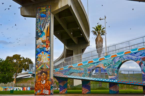 San Diego’s Chicano Park is hidden below the San Diego-Coronado Bridge. More than 70 vibrantly colored murals adorn the support pylons of the freeway overpass. The murals pay tribute to the history of the surrounding Mexican-American and immigrant community called Barrio Logan.