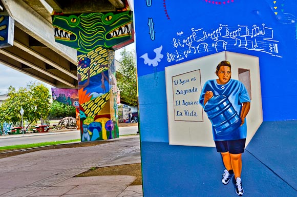 The artists painted historical stories using the symbolism of Aztec and indigenous cultures. California social justice advocates, César Chávez, Dolores Huerta, and the United Farm Workers are shown in various works, as are inspiring Mexican revolutionaries and muralists Frida Kahlo, Diego Rivera, David Alfaro Siqueiros, and José Clemente Orozco. Stories of local struggles with land rights, pollution, and community disinvestment are also documented. It was discouraging to see that murals painted 30 years ago speak to continuing struggles of poverty, immigration, and human rights in California and around the world.