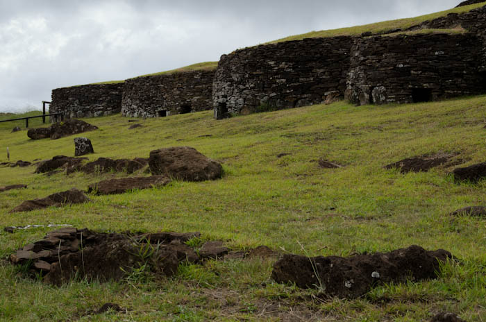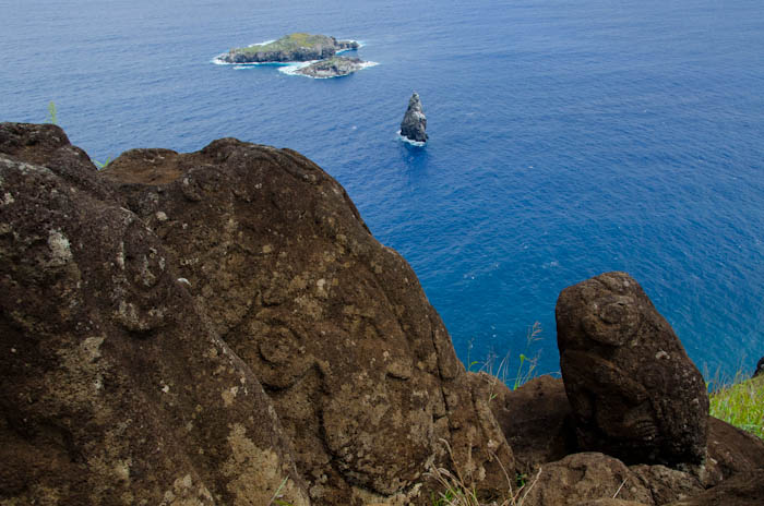 Our second day, we hiked up to the Rano Kau crater and the Orongo petroglyphs and ruins. At the top of this volcanic crater (a landscape like no other), was the Orongo community of religious significance to the native people. This is where the Bird Man competition was held, an annual contest of all the island’s tribes to retrieve the first egg of the sooty tern, a bird that roosts on a small islet off the coast. The competition involves climbing down the cliffs, swimming across a shark filled channel, and camping on the islet until the bird eggs arrive. The first competitor to complete the task became king, ensuring peace between the tribes (at least until Western Explorers arrived and enslaved nearly everyone). The rocks overlooking this view were covered with petroglyphs telling stories of this contest.