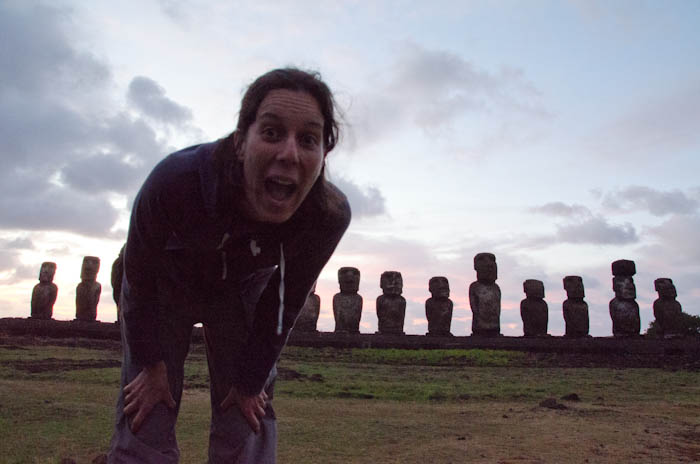 On the third day we rented a car from the owners of the campsite and got up before sunrise to drive to Ahu Tongariki. This ahu is one of the most impressive on the island, with 15 moai lined up along the rugged coast. Before sunrise, in pitch dark, we got out of the car and hiked about 50 yards with the flashlight pointed straight down so we didn’t trip. Then, we searched with the light, finally coming upon the moai. Seeing the imposing, 50 ton megaliths in this light, was an awesome, if a bit creepy, experience.