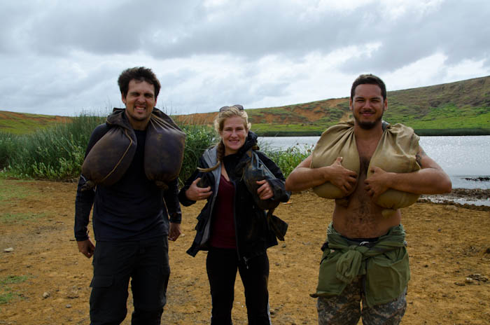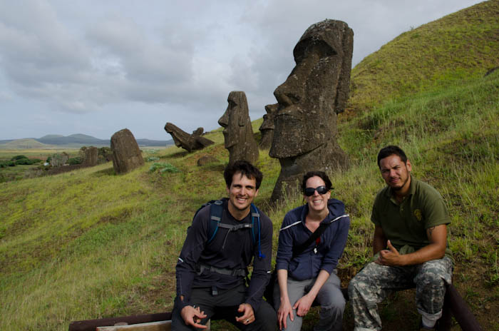 We then went to the quarry at Rano Raraku. This volcano was the origin of the vast majority of the moai on the island and we saw hundreds of the massive statues in various stages of completion. We met up with a guy who works at the park who told us a lot about the statues and the theories of their existence. It turns out, he’s training to compete in an annual triathlon they have to recreate the indigenous contests of the island (not the bird man competition—sorry, Cesar!). He showed us the heavy, weighted sand bags that they would have to wear around their neck for a long run around the rim of the crater.