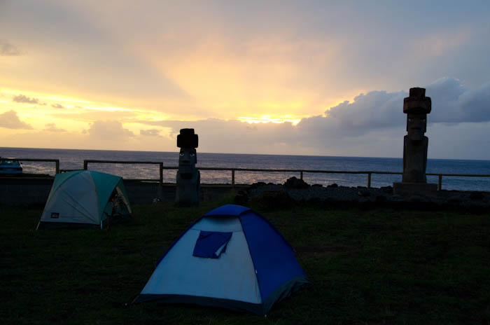 Upon arriving at our coastal camp ground where we stayed for the duration of our time on the island (Camping Mihinoa—the best deal on the island at about $12 US per person per night), we saw our first two moai (giant stone heads). Of course they were fake, but they added to the atmosphere of our campsite.
